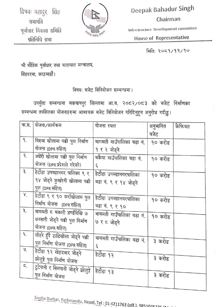 मकवानपुर। मकवानपुर जिल्लाको पूर्वी क्षेत्रमा अवस्थित बागमती गाउँपालिका वडा नम्बर १ र २ लाई जोड्ने चिरुवा खोलामा पुल निर्माणका लागि अर्थ मन्त्रालयबाट रु २५ करोड बजेटको स्रोत सहमति सुनिश्चित भएको छ। लामो समयदेखि पुलको अभावमा स्थानीयवासीले भोग्दै आएको सास्ती, दुःख र जोखिम अब अन्त्य हुने दिशातर्फ अघि बढेको छ। वर्षायाममा खोलामा पानी बढ्दा आवतजावत गर्न […]