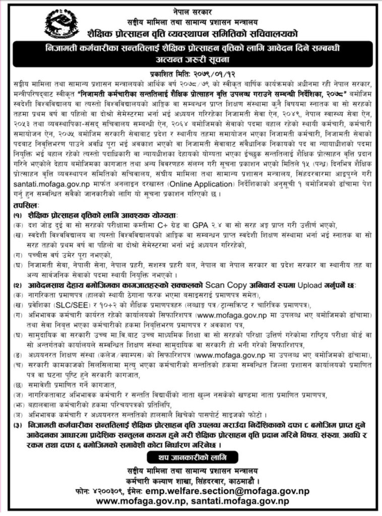 निजामित सेवा ऐन, २०४९, नेपाल स्वास्थ्य सेवा ऐन, २०५३ तथा व्यावस्थापिका संसद सचिवालय सम्बन्धी ऐन, २०६४ बमोजिमको सेवाको पदमा बहाल रहेको स्थायी कर्मचारी, कर्मचारी समायोजन ऐन, २०७५ बमोजिम सरकारी सेवाबाट प्रदेश र स्थानीय तहमा समायोजन भएका निजामती कर्मचारी, निजामती सेवाको पदबाट निवृत्तिभरण पाउने अवधि पुरा भई अवकाश भएको वा निजामती सेवाबाट संवैधानीक निकायको पद वा न्यायधीशको पदमा नियुक्ति भई बहालरहेको त्यस्तो पदाधिकारी वा न्यायधीशका ईच्छुक सनततिलाई शैक्षिक प्रोत्साहन वृत्ति प्रदान गरिने भएको जनाएको छ ।